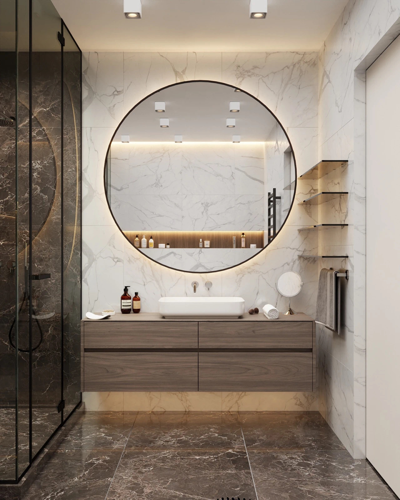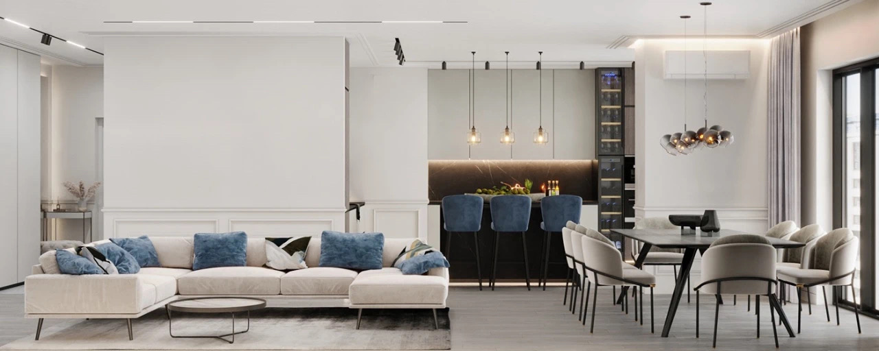 整个公寓的风格都简单纯净,低饱和度让空间看上去更加干净简练,通过简约来体现出屋主的审美高标准。客厅的设计很有现代感,厨房是开放式设计,大大延伸了视觉效果,让空间看上去更加大气和明亮。整个空间看上去非常干练,大理石的瓷砖地面、米色的沙发、餐厅的壁画、简单的几何吊灯,无一不透露着简约的设计理念。厨房、餐厅、客厅三个空间是互通的,让空间看上去更加整体,厨房的壁柜同时兼顾收纳和展示。主卧采用低饱和度的简单装饰,让空间看上去更加柔和,有放松和睡觉的氛围。次卧的设计更加简单大气,通过简单的沙发和床搭配来营造空间,摆放绿植让空间有了颜色对比,增加空间的活力。