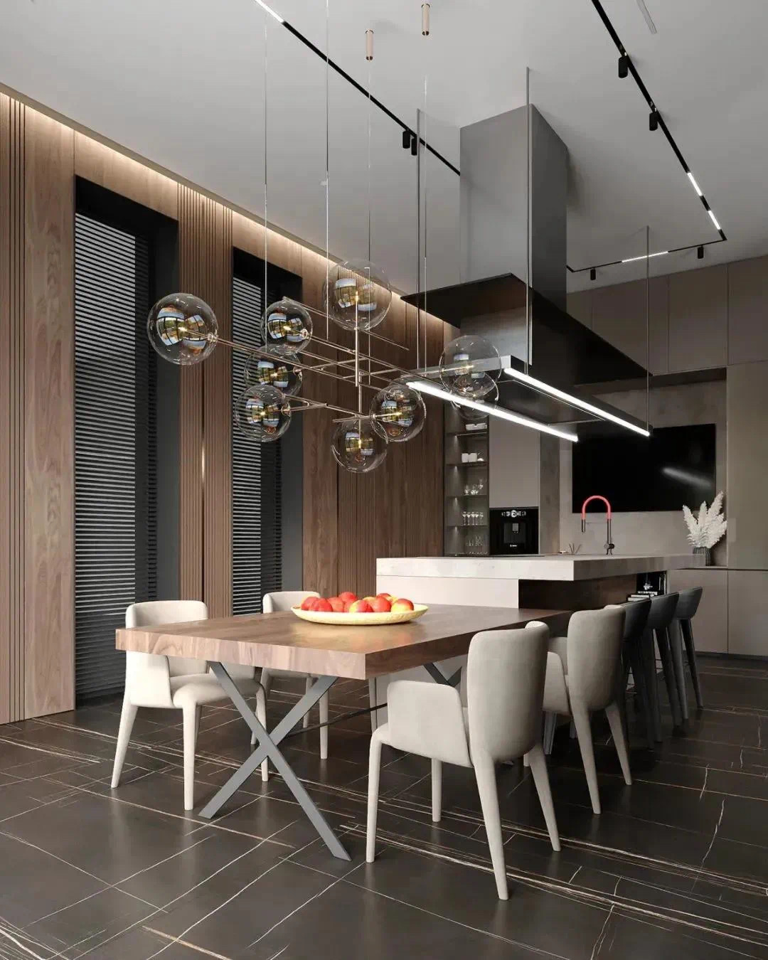 首先是玄关处的设计,富有质感的扶手椅,细腻而粗犷的背景工艺,搭配金属光泽,流露出精致与奢华感。客厅与餐厅处于开放式空间,水晶吊灯彰显奢华,米色皮革、细腻的大理石光泽都在展现不一样的气场。绿植的点缀又恰到好处。二楼弥漫丰富的纹理材质,落地窗引入充足的光线,两把橘色单人椅成为亮色点缀,也与玄关处呼应。棕色的木纹与大理石花纹体现个性的潇洒与自在。二楼弥漫丰富的纹理材质,落地窗引入充足的光线,两把橘色单人椅成为亮色点缀,也与玄关处呼应。棕色的木纹与大理石花纹体现个性的潇洒与自在。
